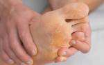 - гиперкератоз (патология, при которой происходит чрезмерное шелушение и отслаивание верхнего слоя кожи ступней, поражённой грибком, верхний слой кожи может полностью иссушиться и слезть);