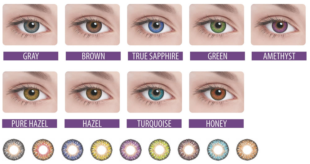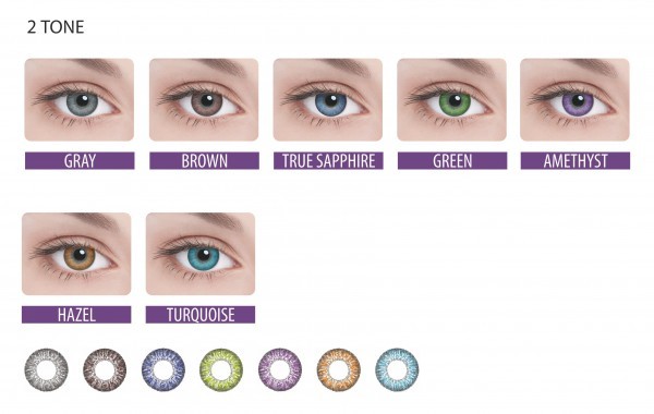 Цветовая палитра включает: серый, медный, коричневый, зеленый, бирюзовый, сапфировый, ореховый, светлый орех и аметистовый. Подобные оттенки доступны и в моделях от Biomedics.