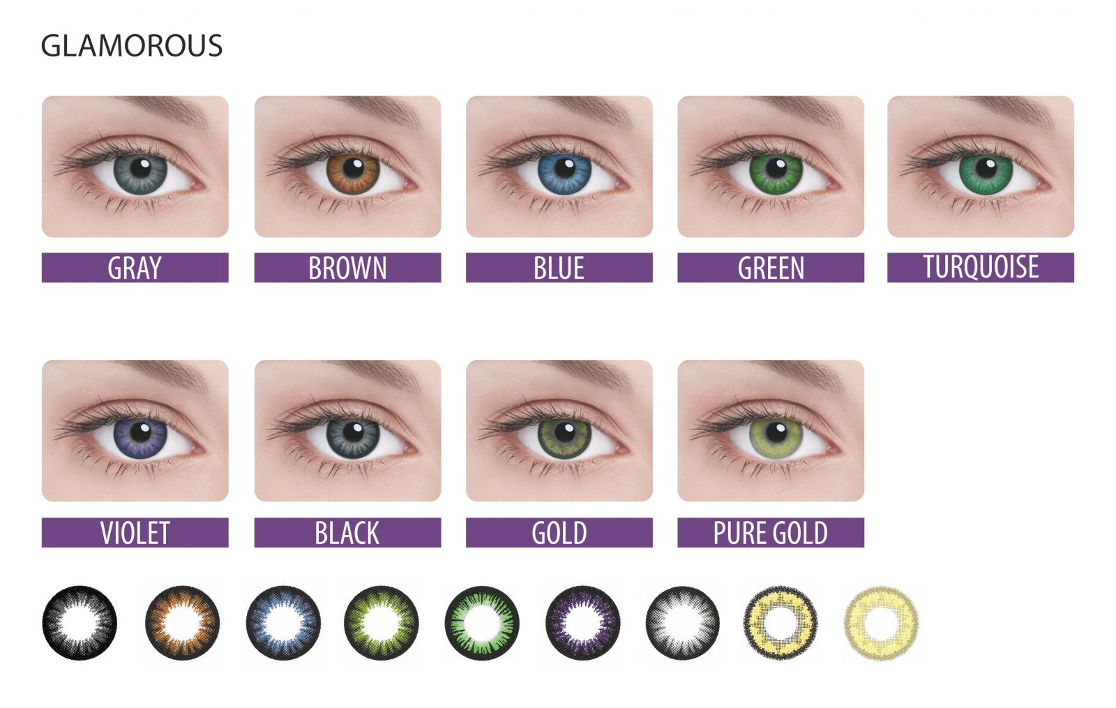 | Glamorous | Линзы с тонким узором, углубляющим взгляд. Цветные Glamorous от Adria скрывают естественную радужную оболочку. Доступно 9 оттенков. |